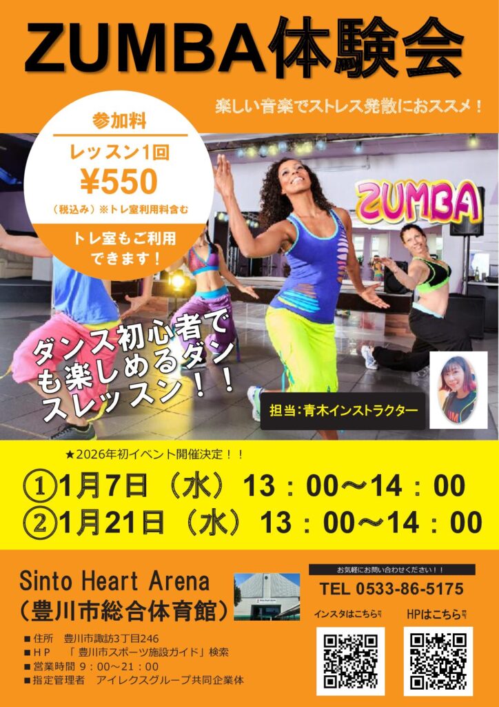 2026年初のイベントとして「ZUMBA体験会」を開催いたします。ZUMBAはラテン系の音楽を使ってパーティー感覚で楽しめるダンスレッスンになります!ストレス発散したい、楽しくダイエットしたいという方にとても効果的です!