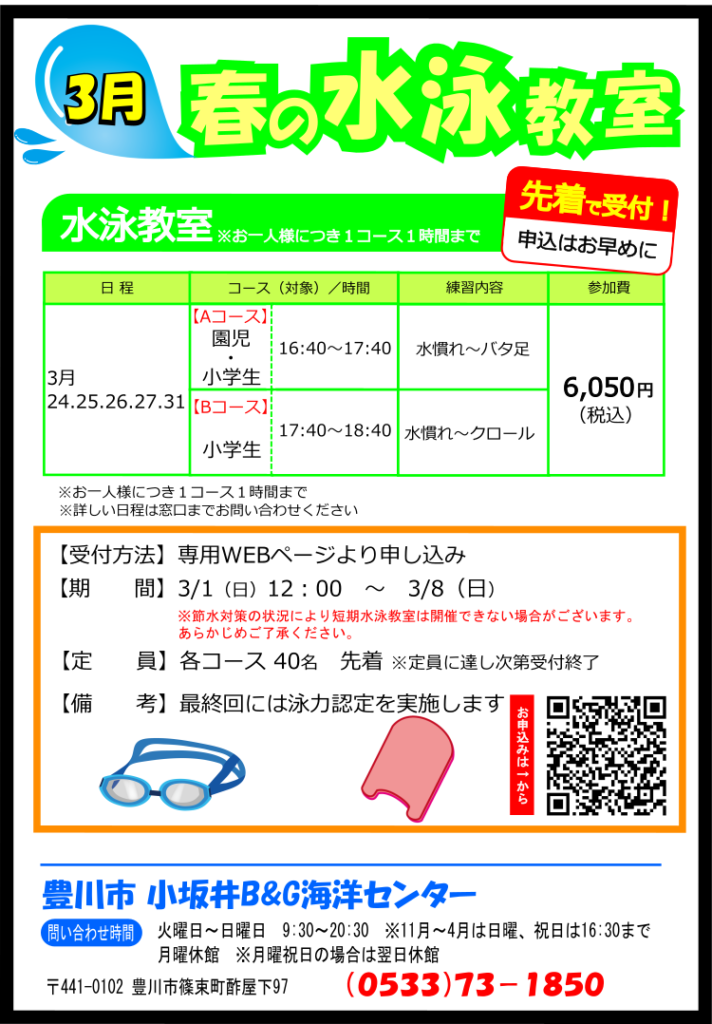 小坂井B&G海洋センター水泳教室募集のご案内です。