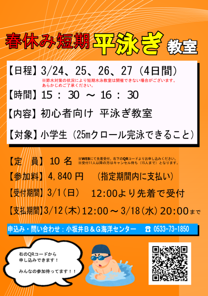 ②③「3月春の水泳教室」「短期平泳ぎ教室」 ‥‥ 募集期間:3/1(日)12:00 スタート ※先着受付中