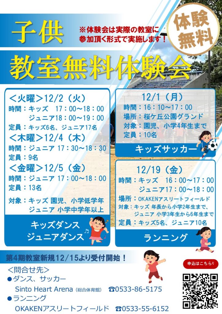 ダンス、ランニング、サッカーの無料体験会が12月に開催決定しました!