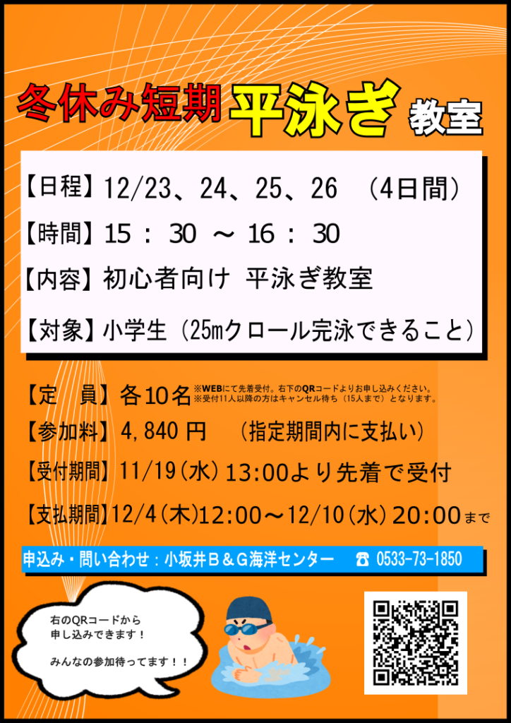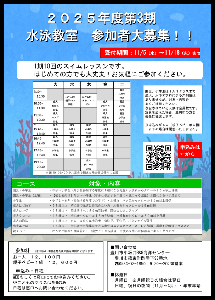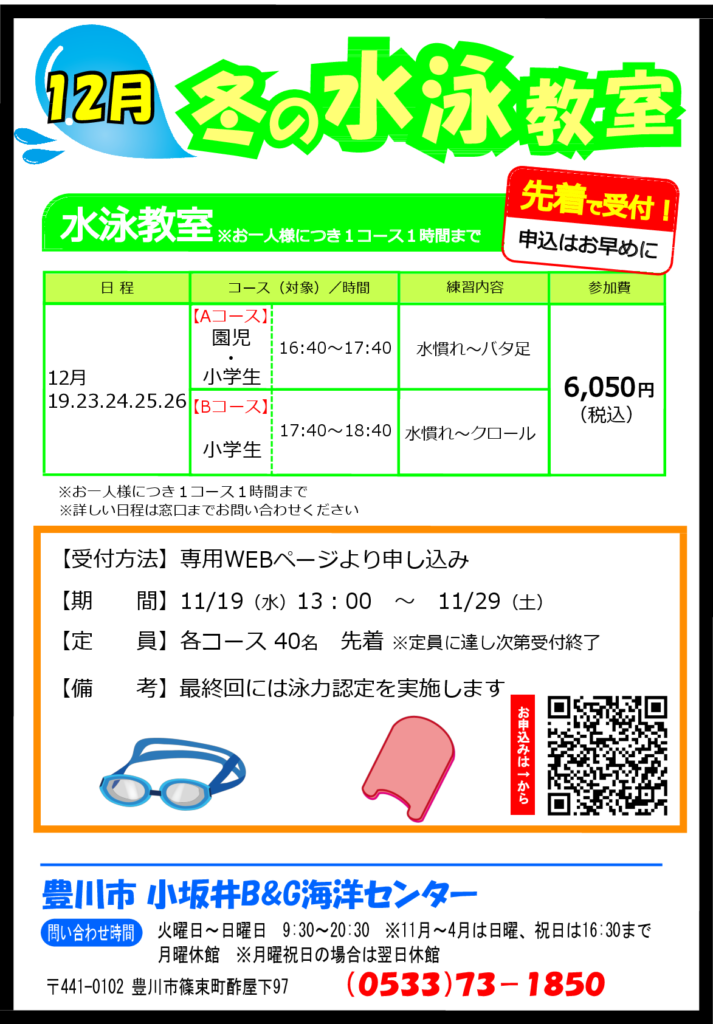 申込方法:WEB(豊川市スポーツ施設ガイド→教室を探す→スイミング)