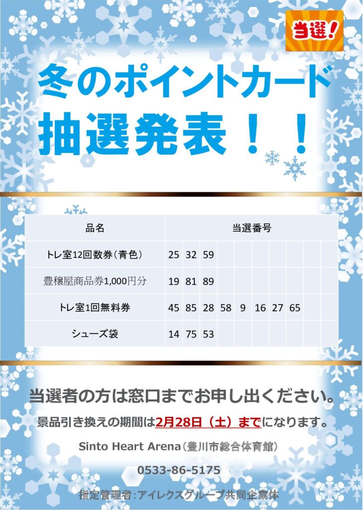 当選者の方は2026年2月28日までにSinto Heart Arena(豊川市総合体育館)窓口までお申し出ください。